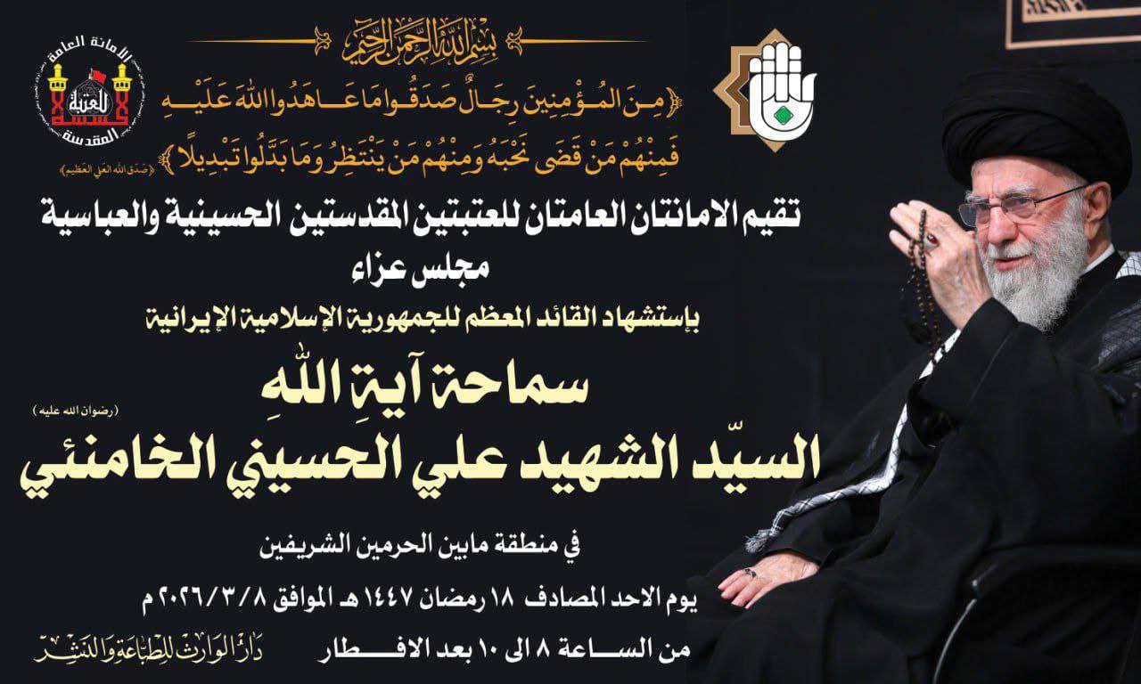  العتبتان الحسينية والعباسية تعلن إقامة مجلس عزاء للسيد الشهيد آية الله علي الخامنئي بين الحرمين المقدسين يوم غد