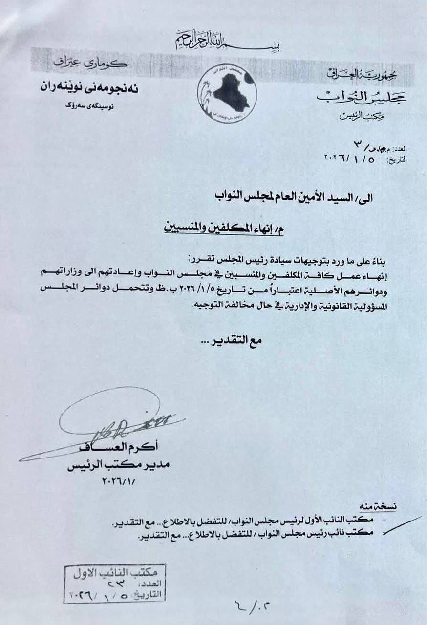 إنهاء المكلفين والمنسبين في مجلس النواب وإعادتهم إلى وزارتهم ودوائرهم الأصلية