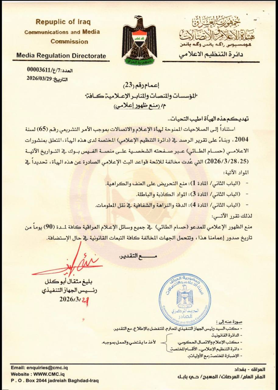 أصدرت هيئة الإعلام والاتصالات، اليوم السبت 29 آذار 2026، الإعمام رقم (23) القاضي بمنع الظهور الإعلامي للمدعو حسام الطائي في جميع وسائل الإعلام العراقية لمدة 90 يومًا، ابتداءً من تاريخ صدور الإعمام.
