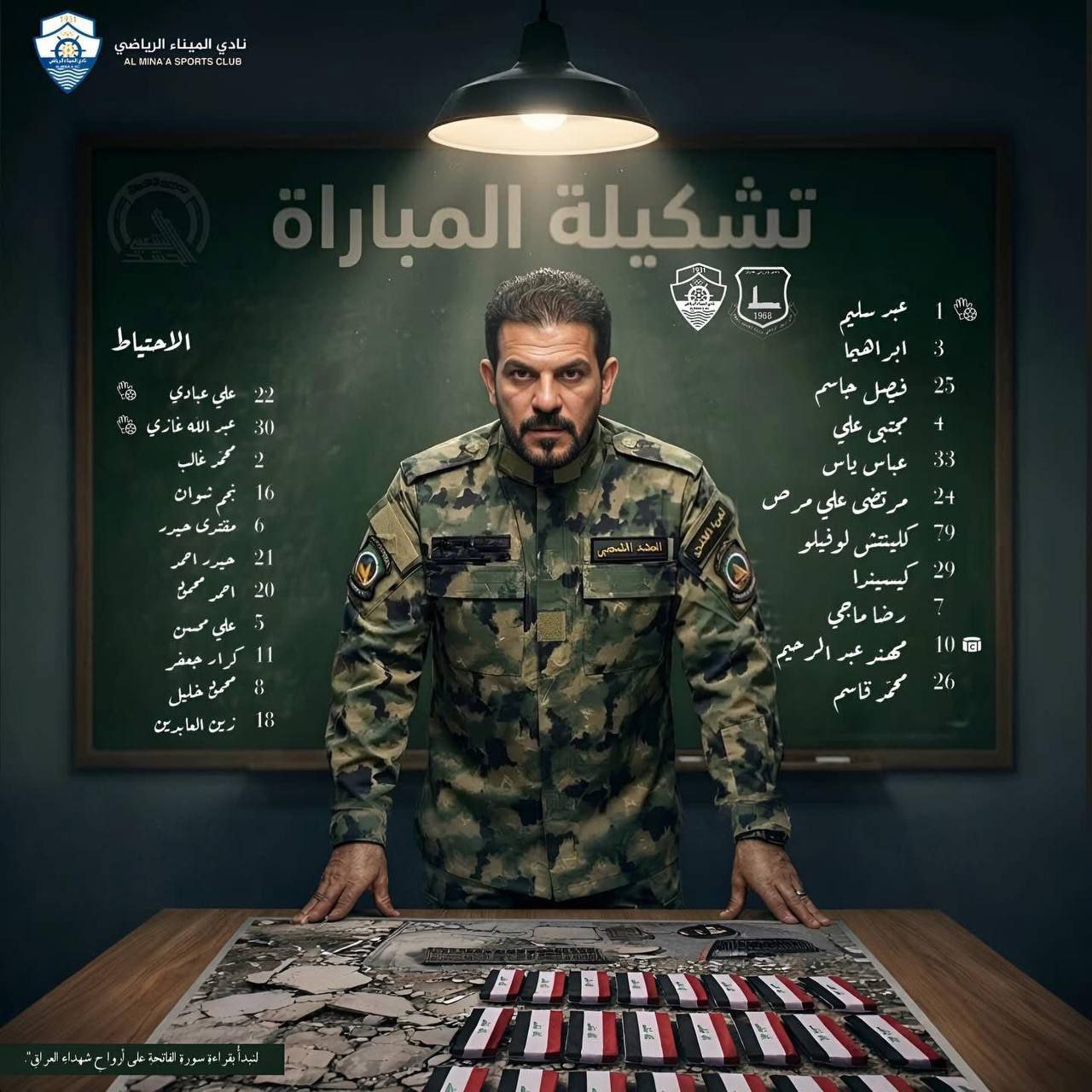 يعرض تشكيلة فريقه بهذه الطريقة تخليدًا وتكريمًا لأرواح شهداء الحشد الشعبي الذين استُهدفوا بالقصف الصهيو-أمريكي في القائم.